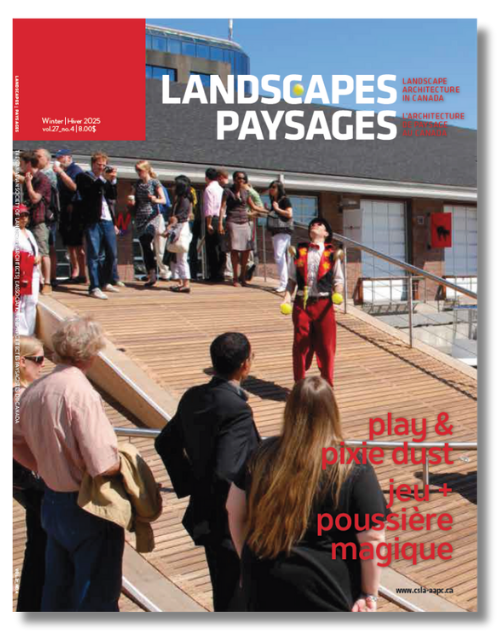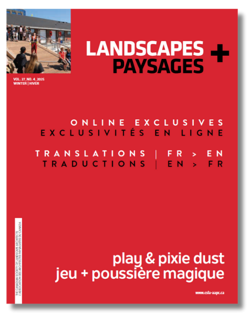 « L’architecture de paysage a ce pouvoir incroyable de concevoir des espaces adaptés à toutes les étapes de notre vie. Le jeu, à l’instar des souvenirs, s’ancre en nous et forge des liens entre les citoyens et les lieux. À une époque où l’unité semble hors de portée, le présent numéro est un appel à l’action : concevoir, entre la réalité et les rêves, le jeu avec sérieux. »