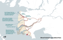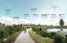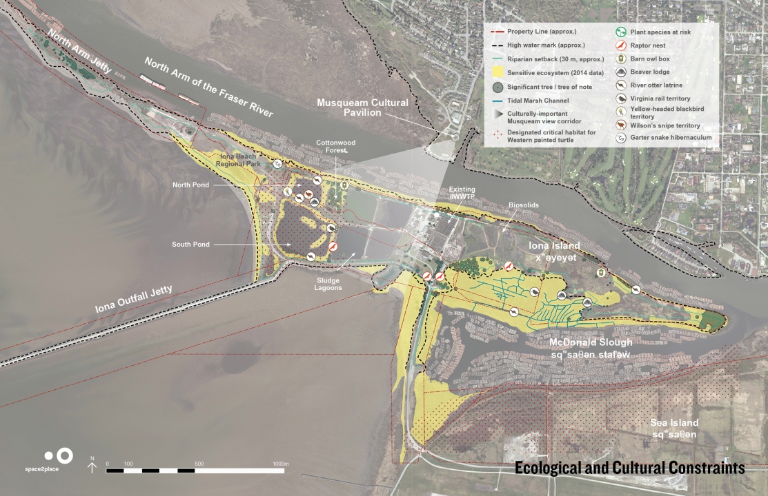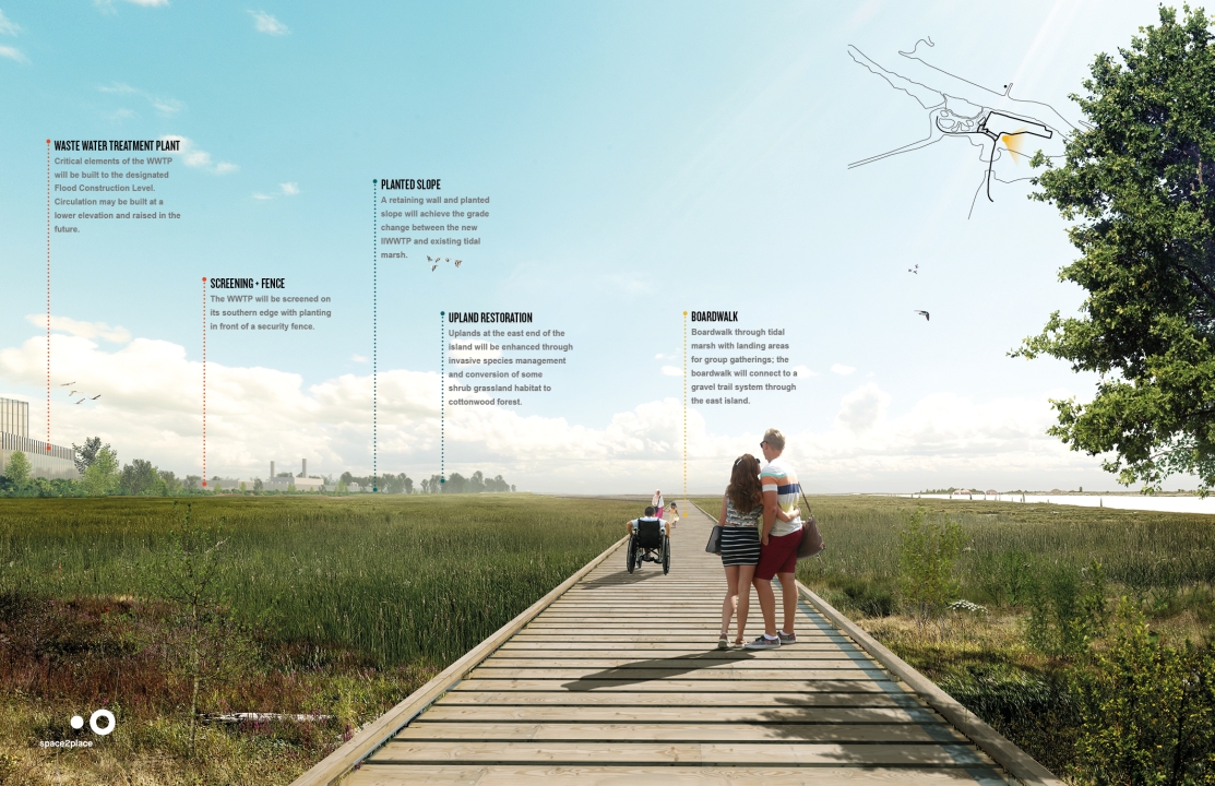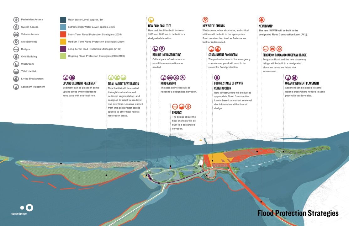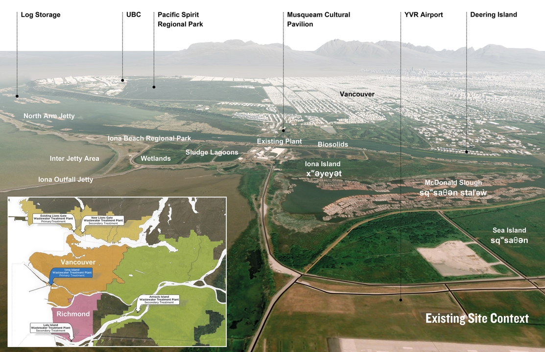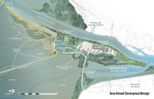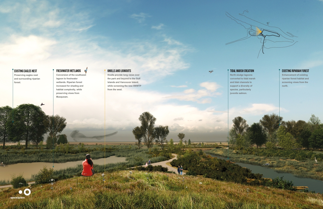 La station d’épuration des eaux usées de l’île Iona (IIWWTP) occupe un emplacement d’écosystèmes complexes. Depuis le début des années 1900, les infrastructures dans l’estuaire du fleuve Fraser ont perturbé les processus naturels ainsi que les habitats des saumons juvéniles et d’autres espèces. Le projet d’IIWWTP permettra de moderniser la station d’épuration grâce à une série de sous-projets de restauration écologique. Le projet dans son ensemble permettra de rétablir le lien entre le fleuve et la mer, de créer des habitats en périphérie, de régénérer et d’étendre les terres humides, et de restaurer les habitats terrestres des hautes terres. Des stratégies écosystémiques de protection contre les inondations seront mises en œuvre pour accroître la résilience de l’île Iona contre l’élévation du niveau de la mer. L’étude de conception s’est déroulée dans un cadre multidisciplinaire avec la contribution de la Première Nation Musqueam (x<məθkųəy əm), de citoyens et d’intervenants. Le projet représente une véritable occasion d’intégrer les notions de restauration écologique, d’adaptation climatique et de réconciliation en vue de valoriser le patrimoine et d’en assurer la pérennité.