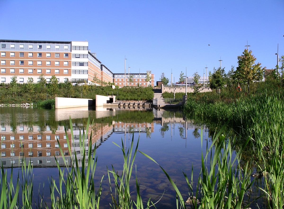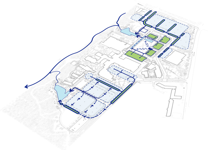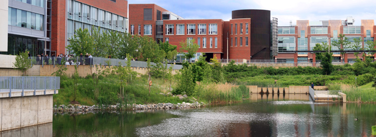 Le rôle du cabinet DTAH consistait à concevoir et à gérer le plan d’aménagement paysager de ce nouveau campus de 10 000 étudiants. L’Institut universitaire de technologie de l’Ontario est construit autour d’un quadrilatère central qui se prolonge par des jardins et des colonnades intimes vers l’environnement naturel et le stationnement. L’aménagement paysager combine des éléments du plan d’aménagement extérieur à des éléments de conception durables. Les eaux de toit et de ruissellement sont dirigées vers des étangs humides, des bassins biologiques et des bassins de rétention des eaux pluviales constituant une infrastructure durable de gestion des eaux de ruissellement qui de surcroît enrichit le paysage du campus. Les matériaux et le mobilier se marient à l’architecture contemporaine du campus composée de pierres calcaires, de béton, de bois et de métal. L’aménagement des plantations mélange des styles de paysage très ordonnancés à des styles naturalisés par la sélection de plantes indigènes.