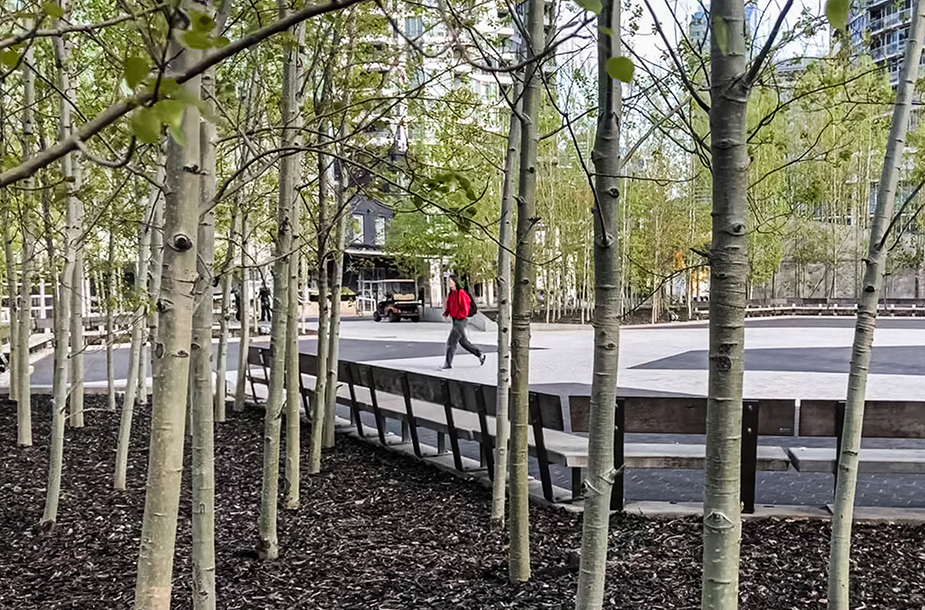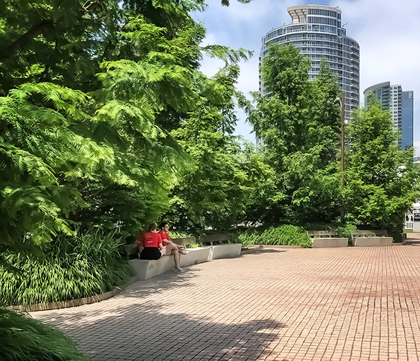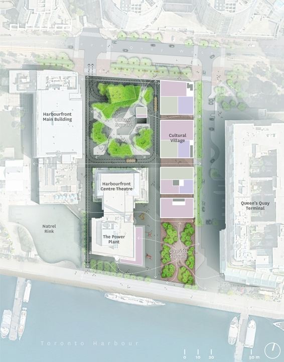 Harbourfront Centre est un projet qui concilie l’urbanité et la végétation naturelle, dans une ville régie par de strictes directives d’aménagement et de foresterie urbaine. L’équipe, dirigée par des architectes paysagistes, a conceptualisé le nouveau visage du square Ontario et du square Canada, une destination culturelle qui apportera un souffle nouveau à l’industrie de l’art contemporain de Toronto. Le nouvel aménagement propose deux places et une série d’emplacements pour le développement de petits immeubles culturels et commerciaux qui viendront appuyer et mettre en valeur la diversité artistique de Toronto. Le square Ontario propose une grande place piétonne qui peut accueillir une variété d’événements culturels et servir de point de ralliement aux moniteurs et amateurs de camps d’arts. Un puits baigne de lumière le garage souterrain, invitant les visiteurs à la vie trépidante de la place. Au bord de l’eau, square Canada propose un espace plus contemplatif qui offre une vue panoramique du lac.