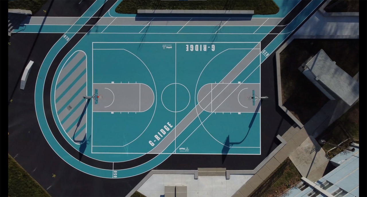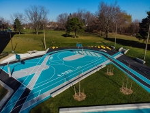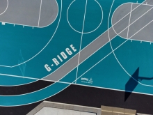 Le terrain multisports réunit des éléments de basketball, de volley-ball, de pickleball, de tennis de table, de planche à roulettes et de parkour, encadrés dans une nouvelle piste dynamique de surfaçage et de course. Il offre également un accès sans obstacle, des places pour les spectateurs intégrées au paysage et un couvert forestier central. Grâce à l’intégration de la cour à la topographie adjacente, elle est devenue un lien entre les activités du quartier.
