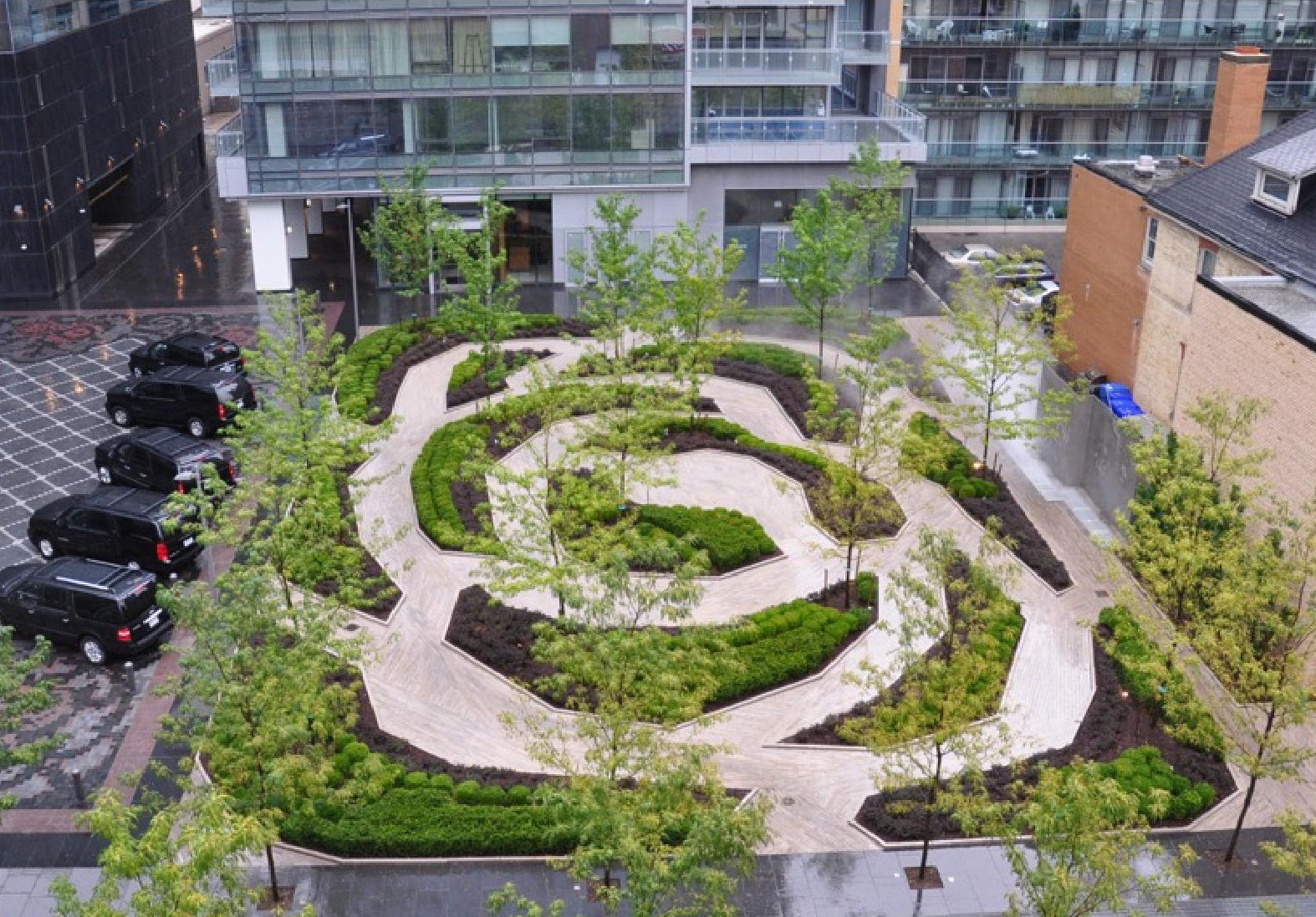 Chacune de ces trois caractéristiques classiques peut être appréhendée au niveau du sol comme depuis les tours adjacentes, car chacune remplit une fonction paysagère essentielle visant à réunir le passé et le présent, et organise cette expérience hautement publique à l’intérieur d’un espace relativement limité.