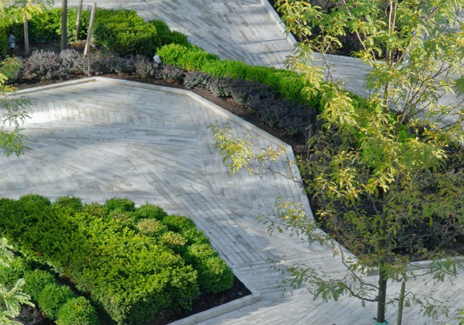 Trois composantes fondamentales tirées de leurs précédents victoriens organisent le paysage : une fontaine haute de quatre étages, un tapis urbain avec une densité de 100 pavés au mètre carré, et une roseraie sans roses où le tourbillon des pétales est fait de massifs d’arbustes et de voies piétonnières.