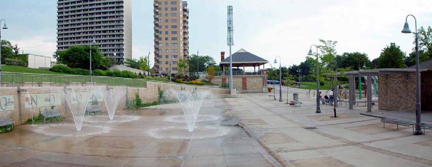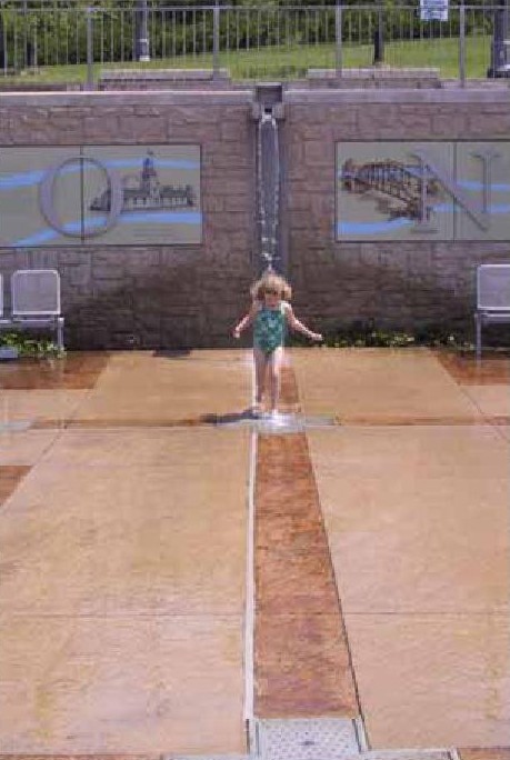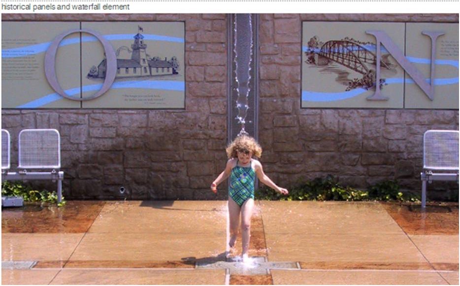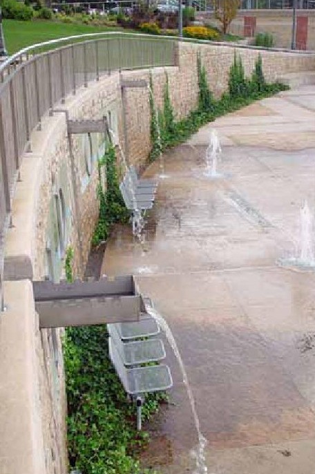 Les changements de grades extrêmes, l’accessibilité et la vue sur la rivière ont défini les paramètres de conception de la place urbaine. Le mur de soutènement de la place forme l’espace, tout en faisant office de paroi structurelle massive et d’élément de la cascade. Il offre aux visiteurs un point de vue élevé sur la place et au-delà. Le mur a été conçu pour s’intégrer en complétant le bâtiment historique adjacent au site. Les visiteurs de la place activent la fontaine interactive, tandis que des jets d’eau venant du sol, des cascades, des brumisateurs et un éclairage à fibres optiques ajoutent à la cascade et à l’utilisation de cette place en constant changement. Les prochaines phases de développement comprennent un pavillon avec des espaces commerciaux, de la restauration décontractée, ainsi qu’un vestiaire et des installations sanitaires. Un prolongement de la promenade riveraine comprendra une zone de théâtre ouvert et une aire de jeux pour les enfants.
