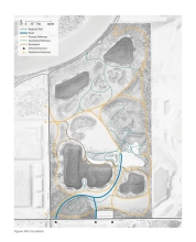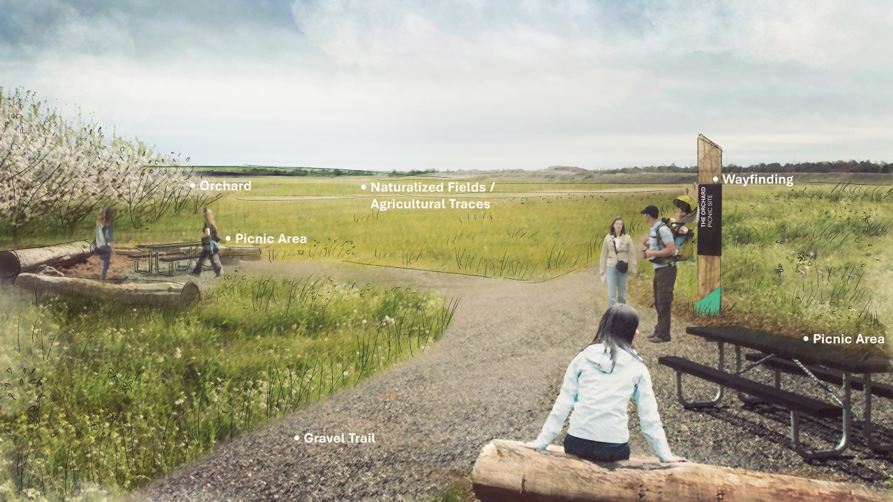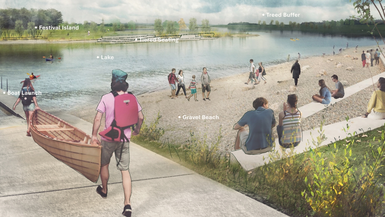 Les principales caractéristiques sont les suivantes : un habitat humide diversifié façonné à partir des fosses d'extraction restantes, avec des promenades, des plages et des points de mise à l'eau offrant des expériences aquatiques intimes, un lieu de rassemblement central qui accueille les utilisateurs et les guide à travers le parc, une pelouse centrale qui offre un espace pour les grands rassemblements et les cérémonies, ainsi que des sentiers et des chemins étendus qui se connectent au système régional plus large.