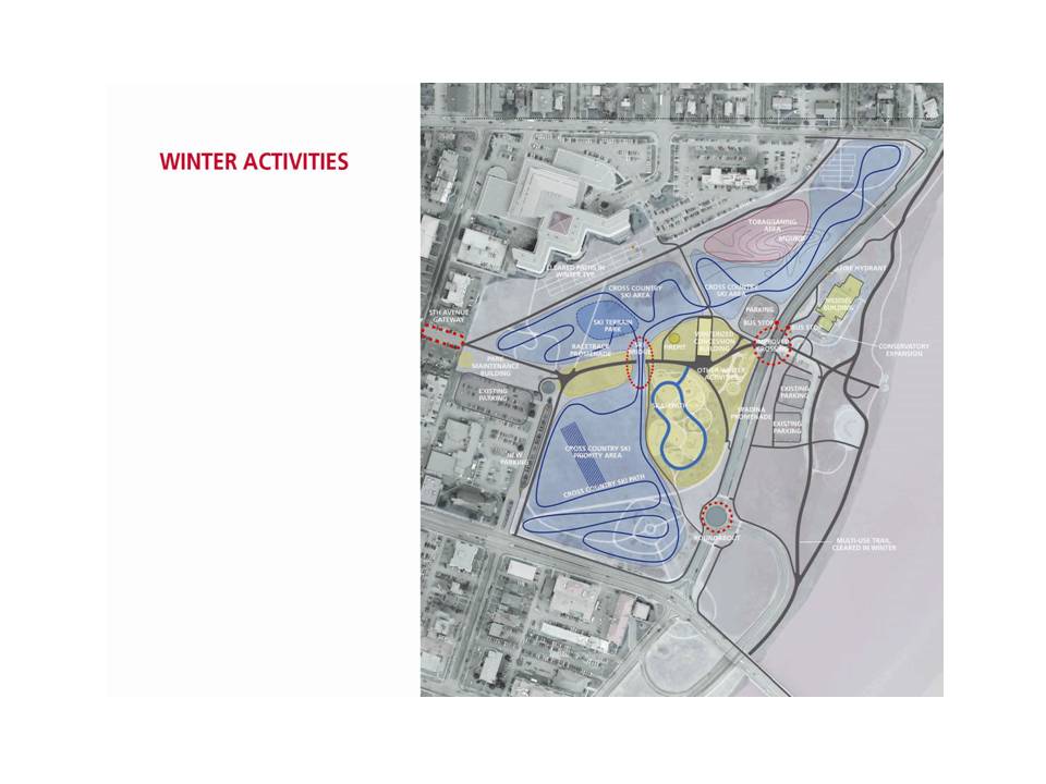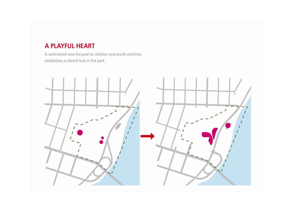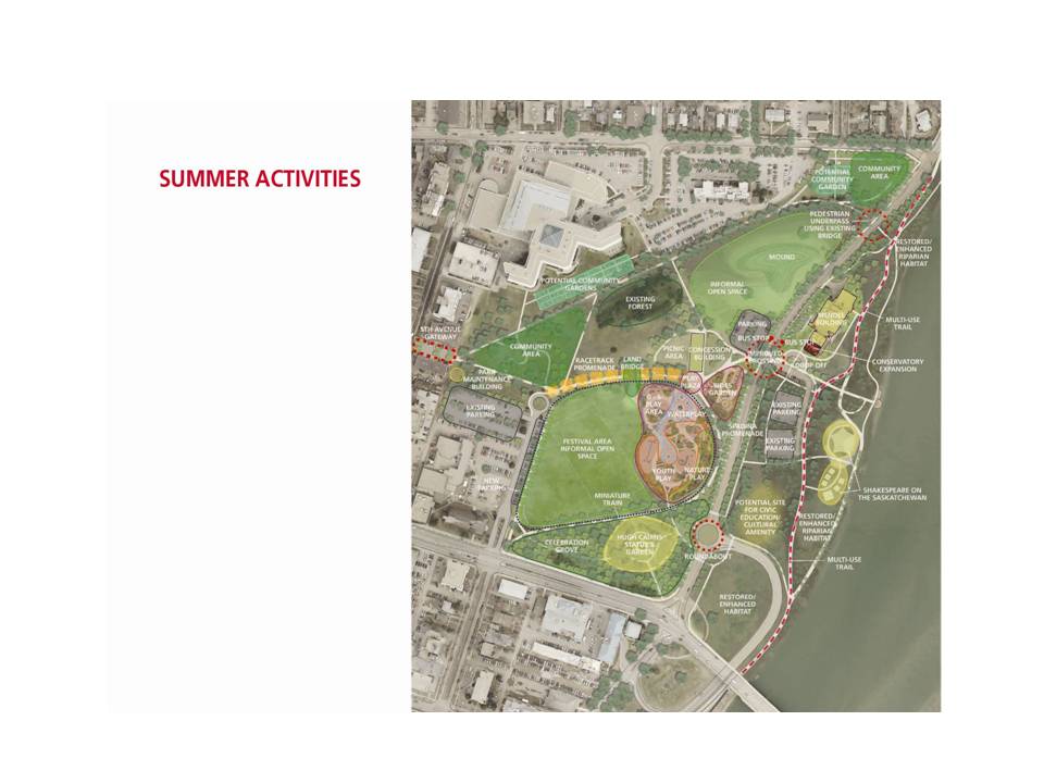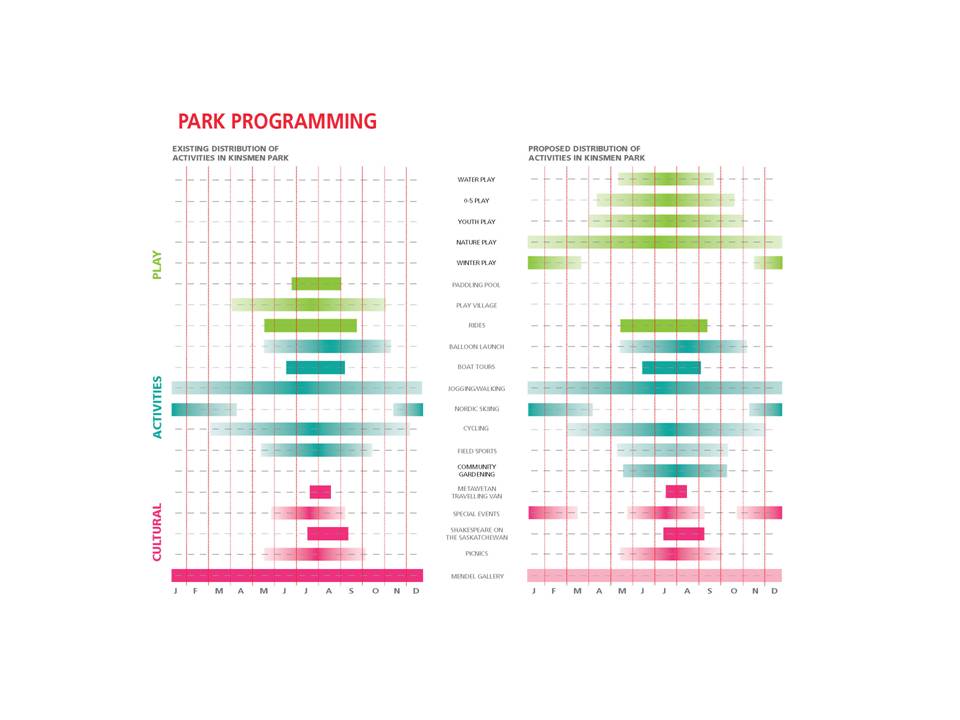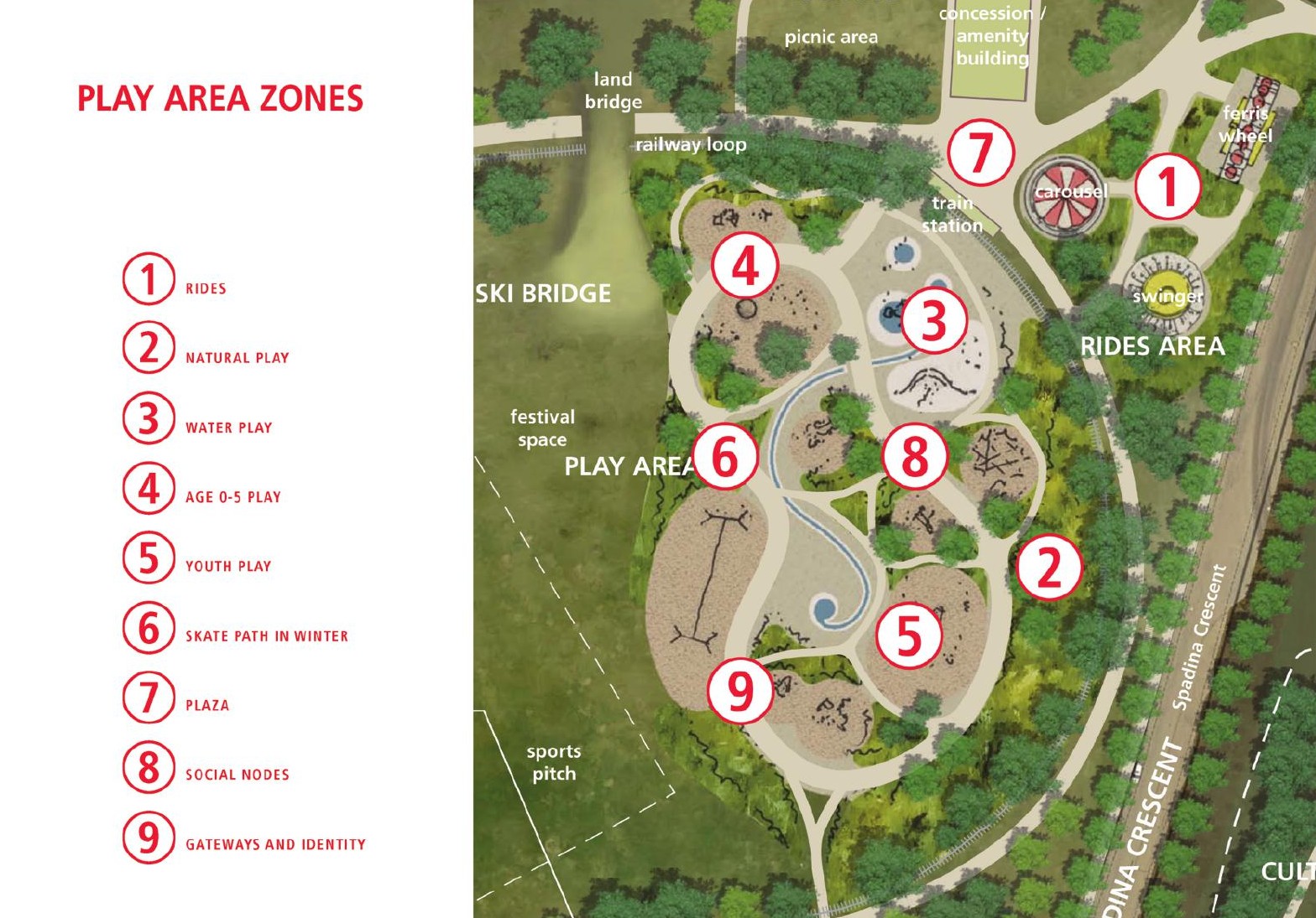 La conception du plan directeur du parc Kinsmen et du voisinage a été dirigée par space2place design inc. en vue de créer un « parc dont l’environnement est particulier au lieu, qui est mémorable et agréable pour les gens de tous âges et qui accorde une attention particulière aux activités pour les enfants ». Le plan est le fruit d’un processus public réfléchi ayant permis de déterminer les priorités, notamment une meilleure intégration du parc dans le croissant Spadina, la création d’un lieu consacré au jeu au cœur du parc, la remise en état des berges et la création d’un centre d’activités hivernales. Les membres de l’équipe comprenaient Matthew Woodruff Architecture, Id_a Public Art Consulting et Associated Engineering.