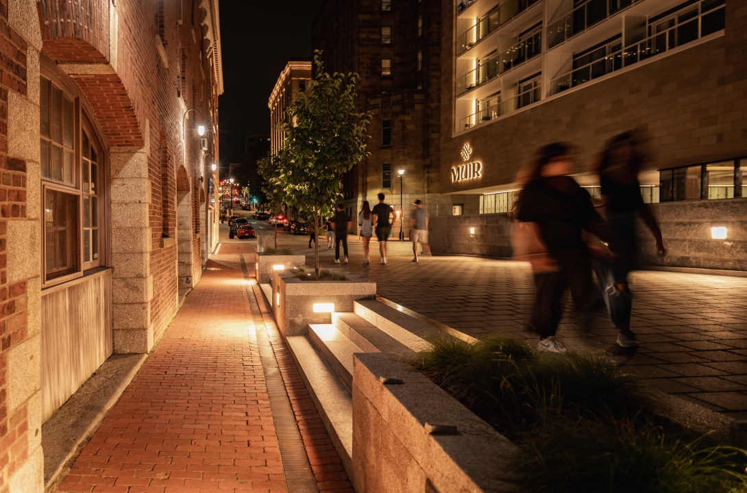 La Bosque Gallery, qui facilite la croissance des arbres sur le toit du parking et au milieu des embruns, offre une échappée tranquille avec des vues panoramiques sur le port. Incorporant des éléments tels que des planches de terrasse en pruche, du métal muntz et des briques d'argile récupérées, la conception honore avec éloquence le patrimoine maritime d'Halifax. Le granit monolithique poivre et sel relie le projet au paysage côtier accidenté de la Nouvelle-Écosse. Le système d'éclairage soigneusement intégré de Fathom transforme l'espace en un captivant havre de paix au bord de l'eau la nuit.
