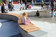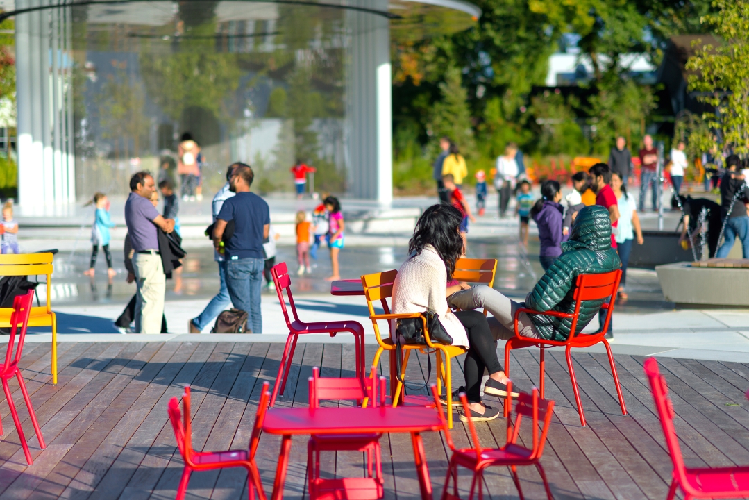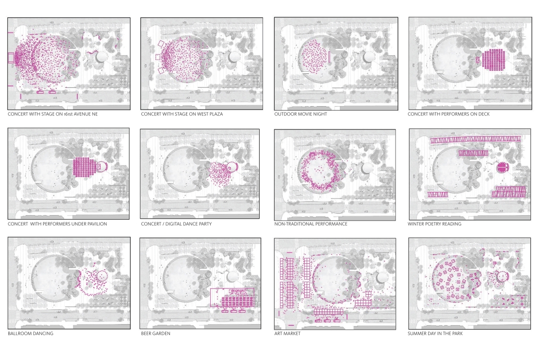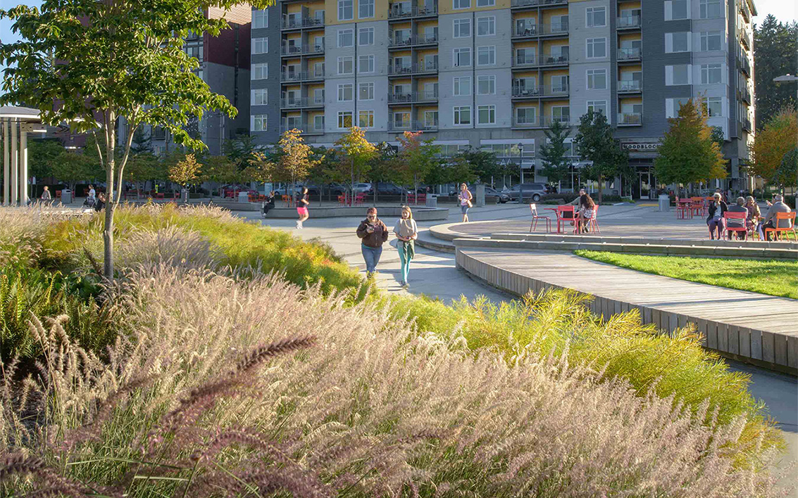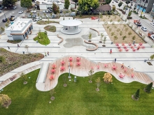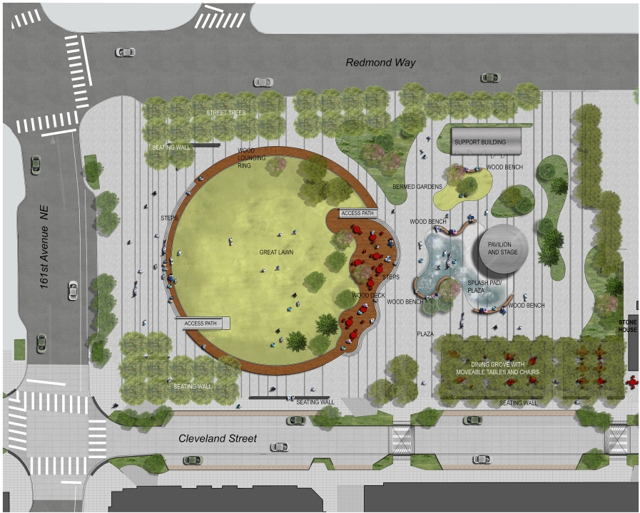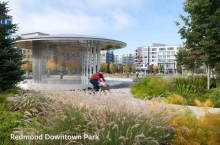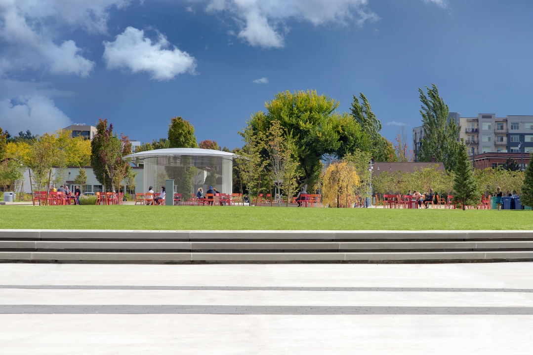 Le Redmond Downtown Park est un parc urbain à la pointe de la technologie, conçu pour inspirer et soutenir divers programmes communautaires et régionaux. Le projet transforme la mer d'asphalte d'un centre commercial de pièces détachées en un nouveau cœur civique de Redmond, catalysant le développement économique d'un centre-ville en déclin. Le projet s'inspire de l'histoire dynamique du site, qui était autrefois une tourbière et un lieu d'alimentation pour les peuples indigènes, et qui est aujourd'hui la capitale actuelle et future de la technologie dans le nord-ouest du Pacifique. L'équipe de conception a travaillé en étroite collaboration avec les membres de la communauté, les organisateurs d'événements et la faculté de Digipen pour développer un parc ouvert toute l'année qui pourrait fonctionner de manière flexible pour divers événements numériques et analogiques. Le projet comprend une pelouse circulaire de 550 pieds de diamètre entourée d'une promenade en bois éclairée, une place humide/sèche avec un pavillon sculptural, une scène et un mur d'eau, un bosquet pour pique-niquer, des jardins et deux scènes/plates-formes de repos. Des sièges sculpturaux sont imbriqués dans les allées, les bosquets et les bosquets de plus de 100 nouveaux arbres.