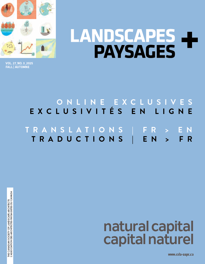 « Nous espérons que ce numéro alimentera votre réflexion professionnelle sur le capital naturel. Qu’il soit un appel à l’action : assimiler le langage et maîtriser les outils, remettre en question les hypothèses, puis concevoir, au-delà de l’efficacité, des aménagements véritablement vivants. »