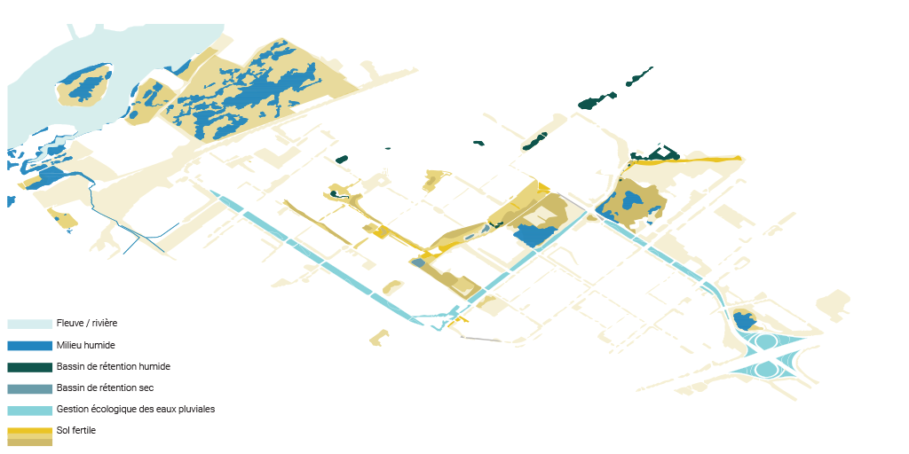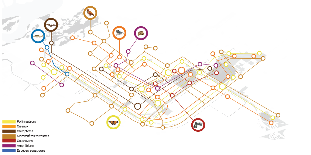 L’intégration de sites actuellement détenus par des propriétaires privés constituera un volet important du projet. La stratégie propose des interventions adaptables qui s’étendent au-delà des limites municipales vers les paysages environnants favorables à l’écologie, appelés paysages de soutien écologique, afin de faciliter la continuité écologique et sociale entre les espaces publics et privés. Bien que ces interventions soient facultatives, elles encouragent la collaboration entre les secteurs public et privé en faveur d’une gestion environnementale et d’objectifs sociaux communs. Le Plan directeur du Corridor de biodiversité de Saint-Laurent, qui est une des premières initiatives visant à promouvoir ce type d’approche intégrée, constitue un précédent pouvant s’appliquer à d’autres villes à travers le monde.