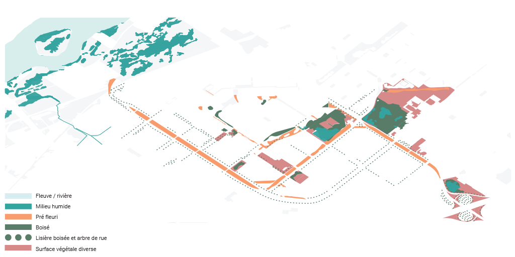 La vision retenue, élaborée par LAND, civiliti, Table Architecture et Biodiversité Conseil en 2018, constituait la base du plan directeur. Le Plan directeur d’aménagement (2019) formulait une vision à long terme concrète pour restaurer la biodiversité et la connectivité au sein du réseau écologique de la ville, ainsi que des interventions à court et moyen terme adaptées au contexte de chaque secteur de l’arrondissement. En soutenant la restauration de la biodiversité et le fonctionnement écologique, tout en améliorant simultanément la qualité de vie urbaine, le Plan directeur établit un cadre unique et intégré d’infrastructures sociales, bleues et vertes centré sur la coexistence afin de favoriser l’épanouissement des populations humaines et écologiques.