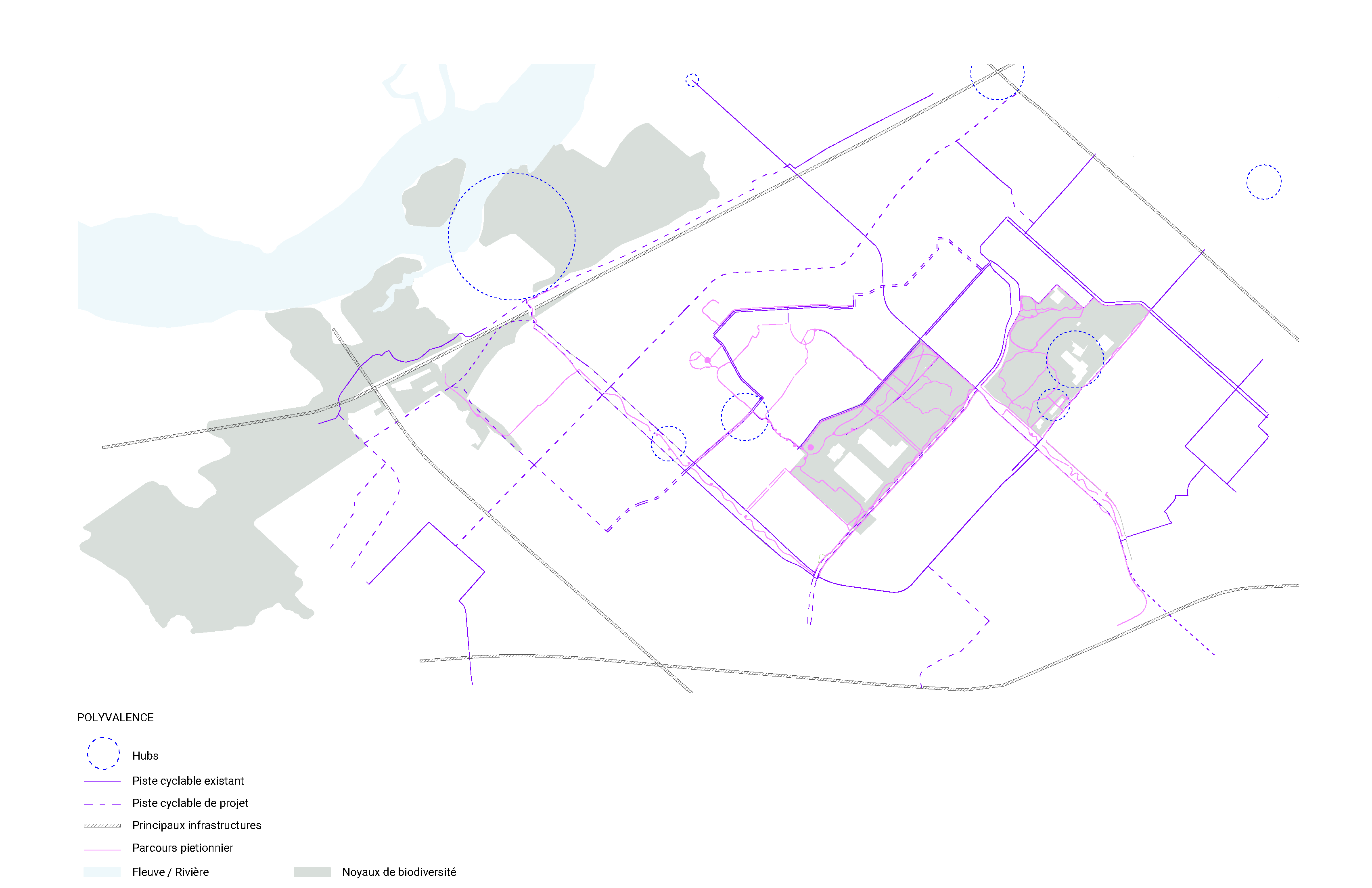 Le cadre global proposé pour le site du corridor comprend des interventions paysagères continues et unificatrices le long de trois routes principales s’étendant aux zones adjacentes vers trois « noyaux de biodiversité » qui servent de points d’ancrage essentiels et se prêtent à des interventions complémentaires. Le tracé de la « colonne vertébrale » du corridor – formée des terrains sous-utilisés situés sous les grandes lignes électriques le long des routes principales – a été au cœur de l’élaboration du Plan directeur. Le Plan directeur du corridor propose la transformation de ces espaces linéaires sous-utilisés afin d’accueillir des prairies fleuries composées de lisières boisées, d’étangs, de sentiers piétonniers et d’infrastructures cyclables améliorées. Ces interventions formeront un corridor continu reliant les espaces verts existants et futurs en comblant les lacunes en matière de connectivité écologique et de transport actif. Elles permettront simultanément d’augmenter la couverture végétale, de créer de nouveaux habitats pour la faune et la flore, et d’atténuer la chaleur urbaine. De la même manière, les infrastructures bleues proposées dans les zones inondables s’appuient sur les infrastructures existantes de gestion de l’eau, établissant une approche à plusieurs niveaux pour renforcer la biodiversité, consolider la connectivité écologique et améliorer la qualité de vie urbaine en général.